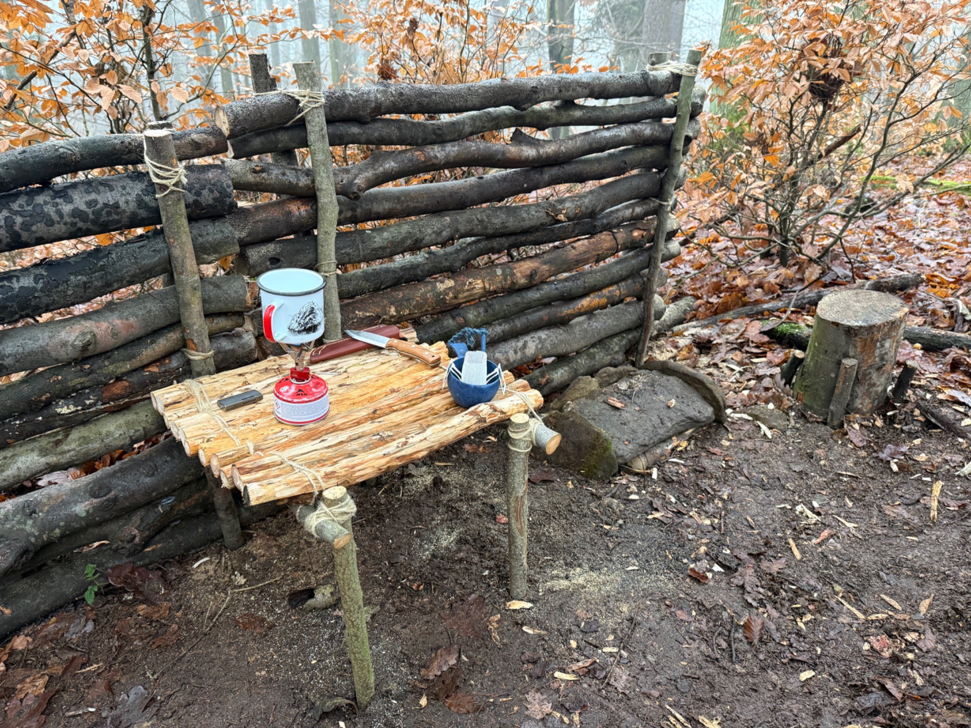 Takýto stôl je ideálny na varenie, prípravu jedla alebo odkladanie výstroja. Je ľahký na výrobu, nevyžaduje žiadne špeciálne náradie a zvládne ho postaviť každý, kto má pri sebe nôž, pilku a kúsok povrazu.